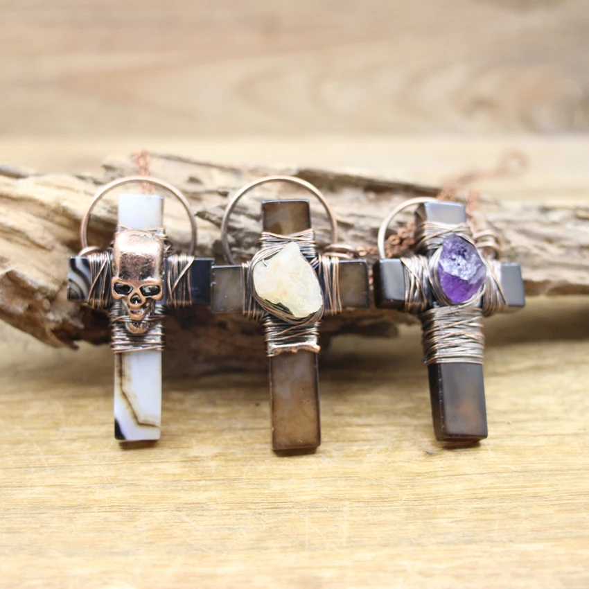 SKU: 8638743609650-natural-agates-cross-soldered-bronze-pendants-antique-copper-wire-wrap-amethysts-citrine-skull-necklaces Category: