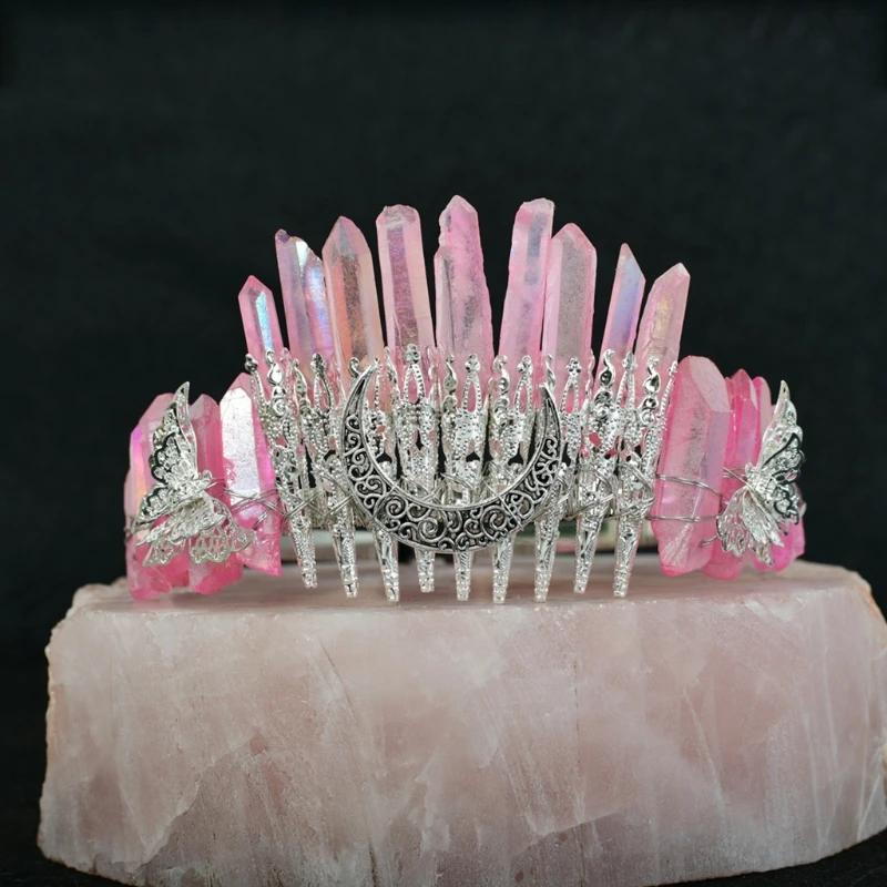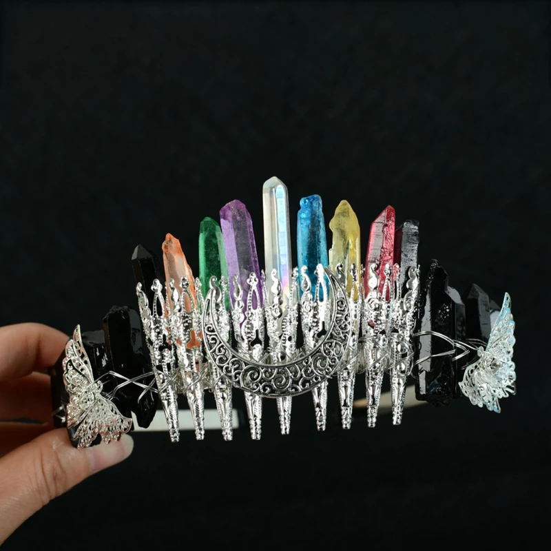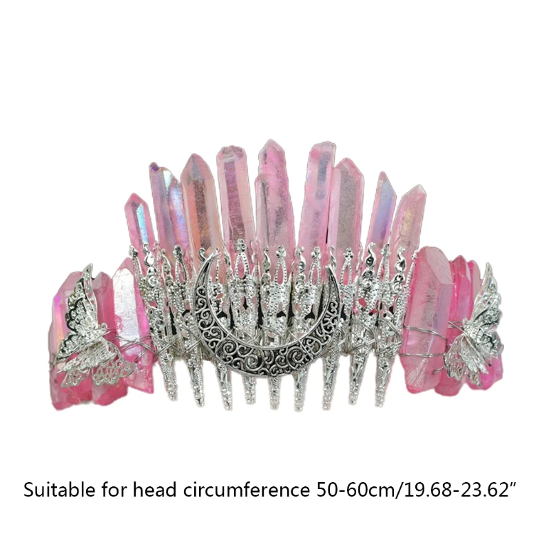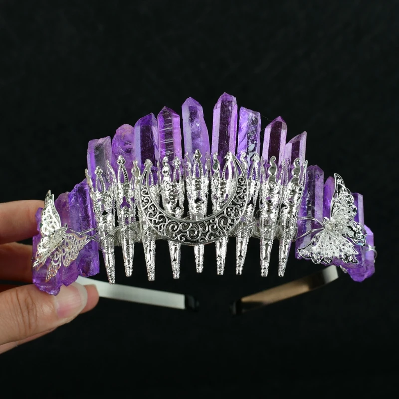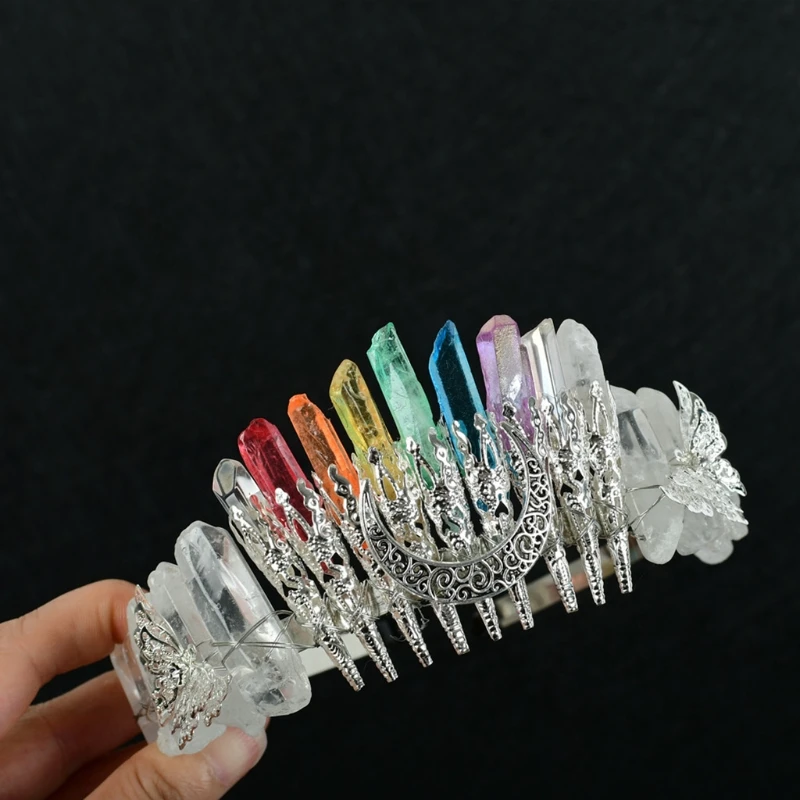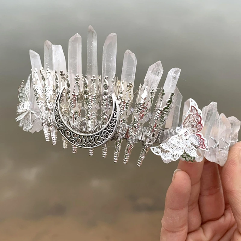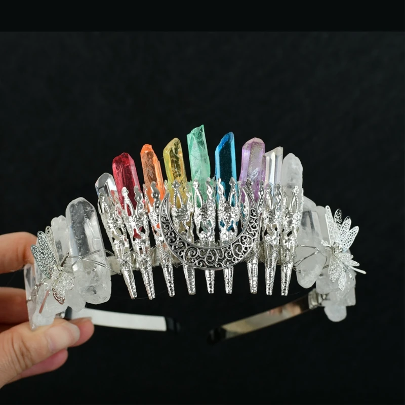 Bridal Wedding Headband Raw Crystal Crowns Headband with Moon Dragonfly Vintage Hairband