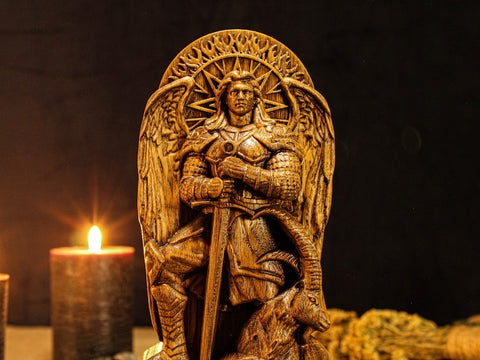 This collectible wooden figurine is crafted in the traditional style, made from natural wood and finished with a protective oil wax coating. It’s ideal for altars or as a unique piece of decor in your home. The figurine does not feature any signatures or logos from our workshop, but if you'd prefer the artisan’s signature, please include a request in the order notes or contact us directly. The back of the statue if flat.
