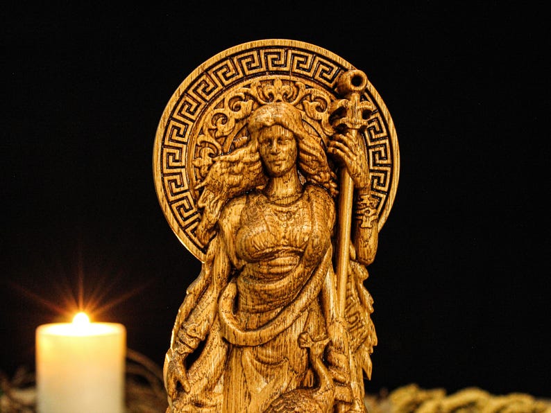 This collectible wooden figurine is crafted in the traditional style, made from natural wood and finished with a protective oil wax coating. It’s ideal for altars or as a unique piece of decor in your home. The figurine does not feature any signatures or logos from our workshop, but if you'd prefer the artisan’s signature, please include a request in the order notes or contact us directly. The back of the statue if flat.