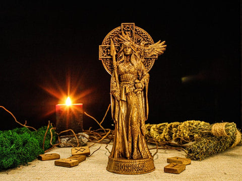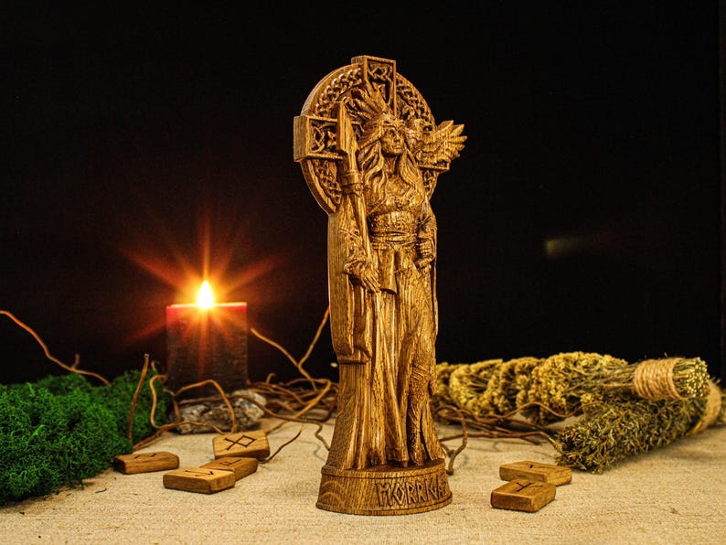 This collectible wooden figurine is crafted in the traditional Scandinavian style, made from natural wood and finished with a protective oil wax coating. It’s ideal for altars or as a unique piece of decor in your home. The figurine does not feature any signatures or logos from our workshop, but if you'd prefer the artisan’s signature, please include a request in the order notes or contact us directly. The back of the statue if flat.