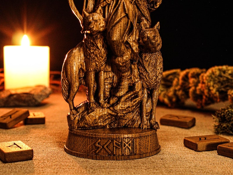 This collectible wooden figurine is crafted in the traditional Scandinavian style, made from natural wood and finished with a protective oil wax coating. It’s ideal for altars or as a unique piece of decor in your home. The figurine does not feature any signatures or logos from our workshop, but if you'd prefer the artisan’s signature, please include a request in the order notes or contact us directly. The back of the statue if flat.